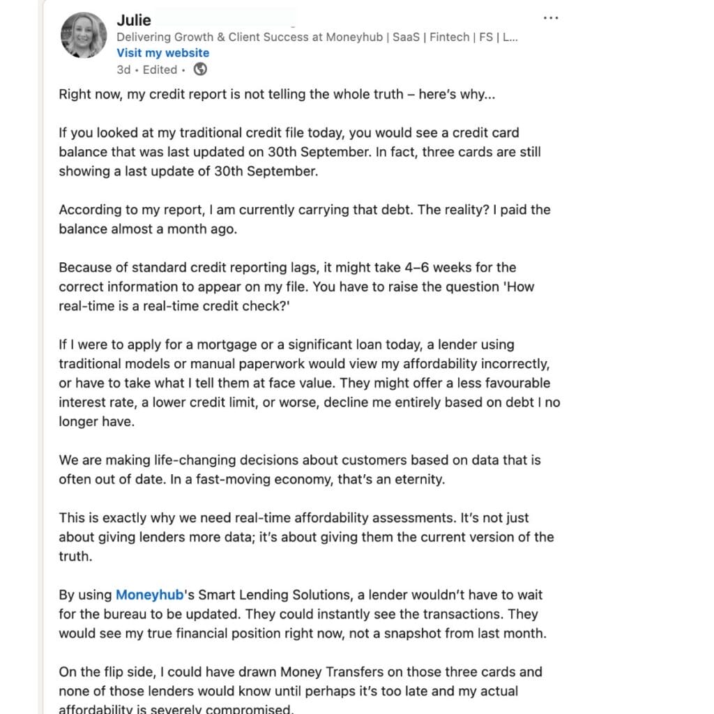 Another hot topic was ‘thin file’ and ‘credit invisible’ users that struggled to access finance from lenders relying solely on Credit Reference Agency data. My colleague Julie expands on this below with a great personal example of why the current system isn’t working: