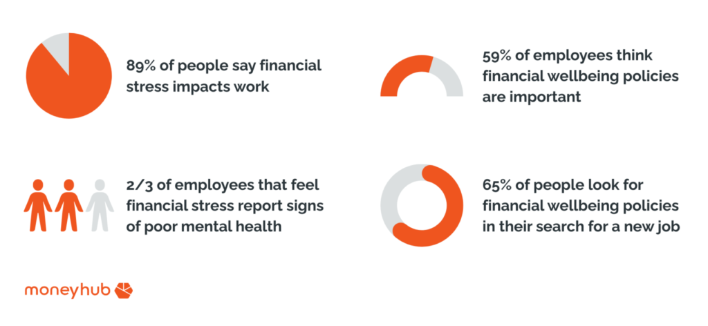 In workplace settings in particular, 89% of people say that financial stress impacts their work. Of those already struggling financially, two-thirds of employees report at least one sign of poor mental health. Factors like a loss of sleep, poor concentration and reduced motivation have all been referenced – and are all components that affect productivity and performance levels at work.